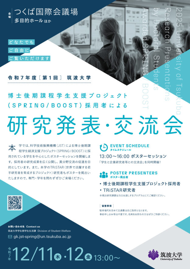 筑波大学は現在、JST(科学技術振興機構)の博士学生向けの経済・研究支援プログラムとしてSPRING、BOOSTと呼ばれる事業に採択されており、学内の選考を通過した多彩な分野の学生...続きを読む
