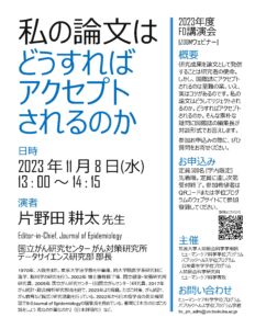 ヒューマン・ケア科学専攻,ヒューマン・ケア科学学位プログラム,パブリックヘルス学位プログラム,公衆衛生学学位プログラムの共催で,Journal of EpidemiologyのEditor in Chiefを務めていらっしゃる片野田 耕太先生(国立がん研究センター)をお招きし,FD講演会「私の論文はどうすればアクセプトされるのか」を開催いたします。
