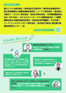 富士フイルム株式会社/TDSE 株式会社/地方独立行政法人東京都立産業技術研究センター/株式会社クレハ/DIC 株式会社/株式会社知能情報システム/三桜工業株式会社/株式会社インテージテクノスフィア/日本ベーリンガーインゲルハイム株式会社/みずほ第一フィナンシャルテクノロジー株式会社/株式会社日本入試センター/富士通株式会社/株式会社日経BP/一般財団法人工業所有権協力センター(IPCC)/オムロン株式会社/地方独立行政法人神奈川県立産業技術総合研究所/住友化学株式会社/株式会社トヤマ/三菱電機株式会社 先端技術総合研究所/MS&ADインターリスク総研株式会社/株式会社HBA/三菱ガス化学株式会社/SWCC株式会社/株式会社島津製作所/エーザイ株式会社/株式会社Ridge-i/日本電信電話株式会社(NTT R&D)/一般財団法人電力中央研究所/株式会社神戸製鋼所/株式会社とめ研究所/AGC株式会社/大日本印刷株式会社/ウエスタンデジタル合同会社/株式会社フレンドマイクローブ/株式会社日立製作所/株式会社SCREENホールディングス/キオクシア株式会社/株式会社アルトナー/株式会社MiDATA/パナソニック エナジー株式会社/株式会社メタジェン/旭化成株式会社/日本たばこ産業株式会社 など(順不同)