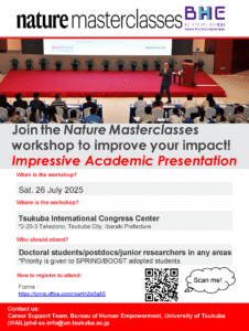 ポスターやスライド発表を通じて研究を直接伝える能力を高めることで、分野内で信頼性を築き、分野外へも影響力を発揮できるようになる内容です。ぜひご参加ください。